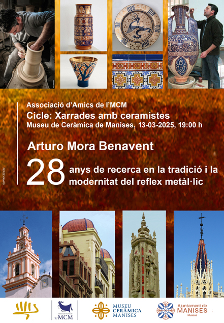 Dentro del ciclo Charlas con ceramistas, los Amigos del Museo de Cerámica de Manises ha programado para el día 13 de marzo de 2025 la intervención de Arturo Mora (miembro de la Asociación de Ceramología) para que exponga las claves de su larga y exitosa trayectoria como ceramista especializado en la técnica del reflejo metálico. [JPC]